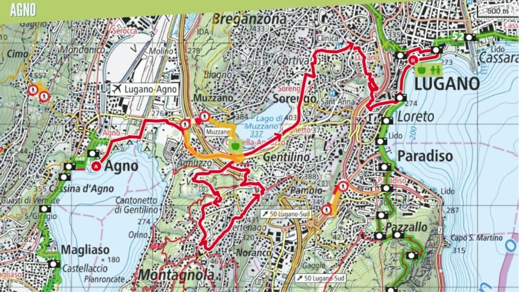 Percorso di media distanza che parte da Agno e arriva a Lugano centro passando da Muzzano, Montagnola e Sorengo. Uno splendido tracciato tutto da scoprire che si snoda tra laghi, colline, boschi e nuclei.